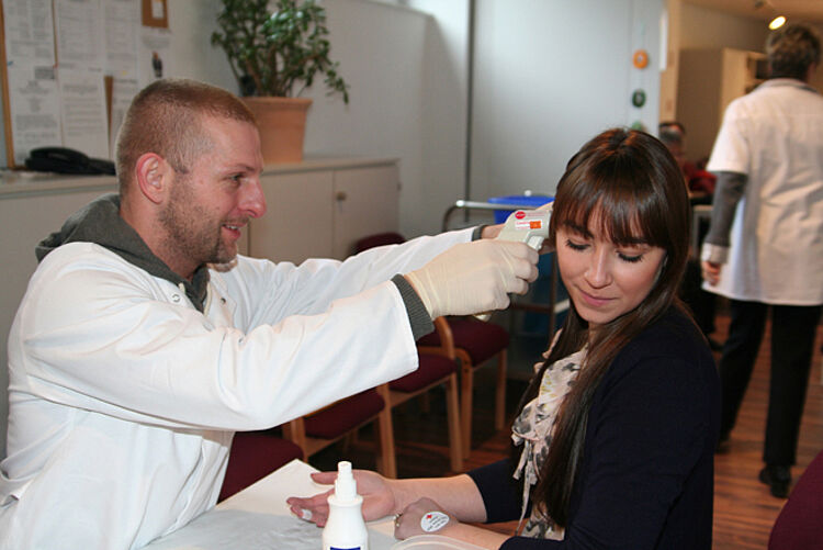 Danach werden die Körpertemperatur (an der Stirn) und der Blutfarbstoffgehalt (Hämoglobinwert) festgestellt. Ein winziges Tröpfchen Blut aus der Fingerkuppe oder dem Ohrläppchen reicht dafür aus. Blutdruck und Puls werden ebenfalls gemessen und alle Werte werden dokumentiert. Alle Daten geben den Blutspende-Ärzten wertvolle Hinweise für seine Entscheidung über die Zulassung zur Blutspende.