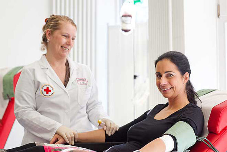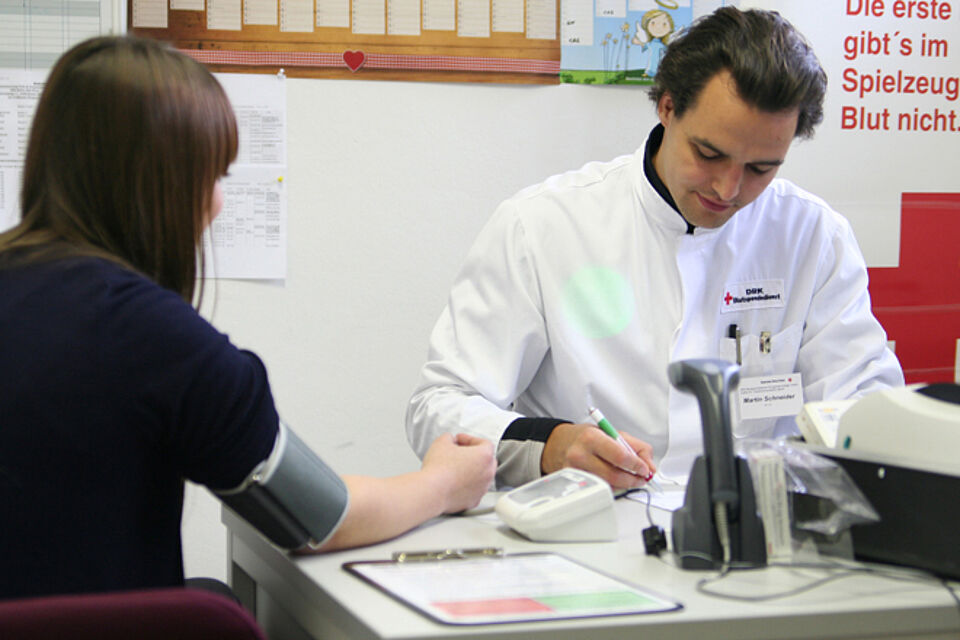 Ein Arzt oder eine Ärztin bespricht mit Ihnen den ausgefüllten Fragebogen, die erhobenen Gesundheitsdaten und entscheidet dann, ob Sie heute Blutspenden können. Ebenso wird der Blutdruck und der Puls vor jeder Blutspende geprüft.